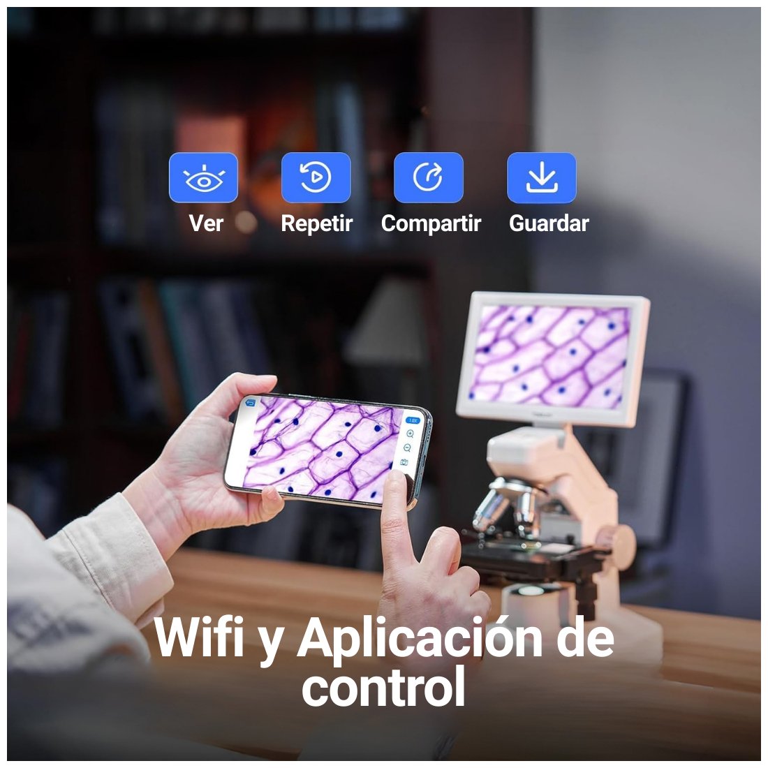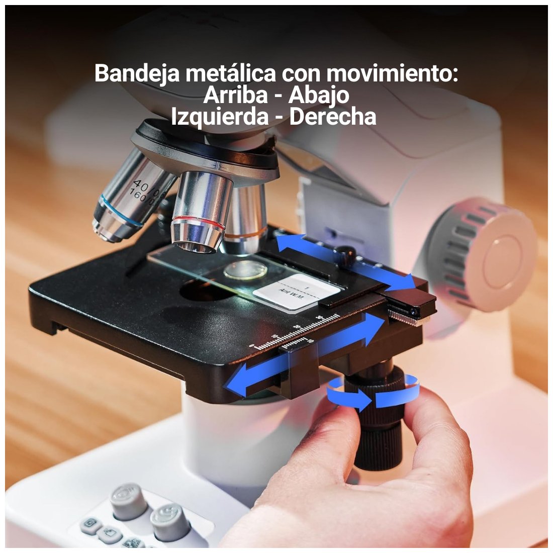 Microscopio compuesto monocular con rango de aumentos de 40x a 2000x, diseñado para niños, adultos, uso educativo y aficionados a la ciencia. Cuenta con iluminación LED superior e inferior, sistema de enfoque grueso y fino y estructura robusta que garantiza estabilidad y precisión en la observación.