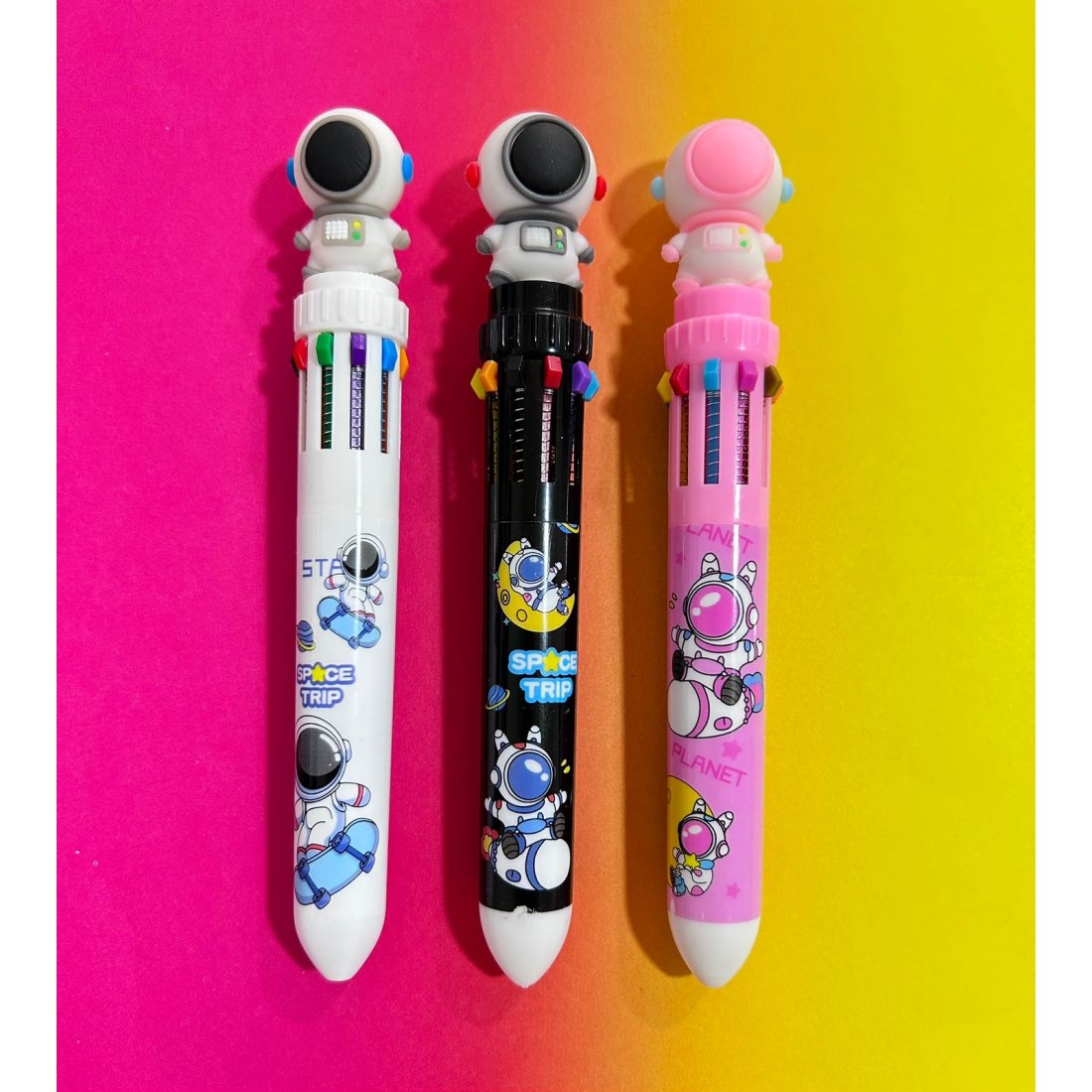 Esfero multicolor con diseño de astronautas, disponible en blanco, negro y rosado. Incluye 10 colores en un solo bolígrafo: negro, rosado, azul, amarillo, café, rojo, verde, morado, azul cielo y naranja. Ideal para estudio, oficina o uso creativo