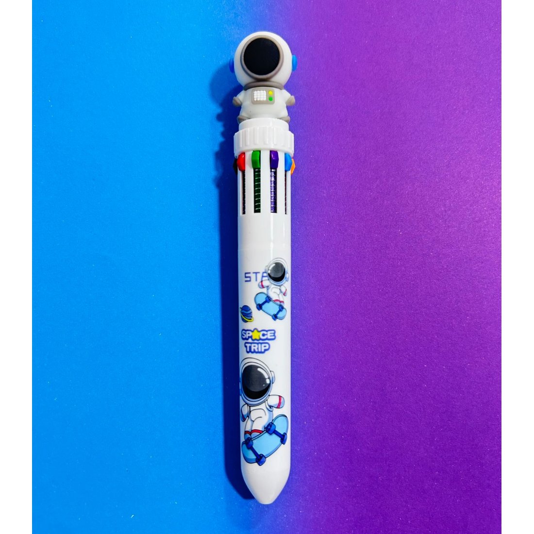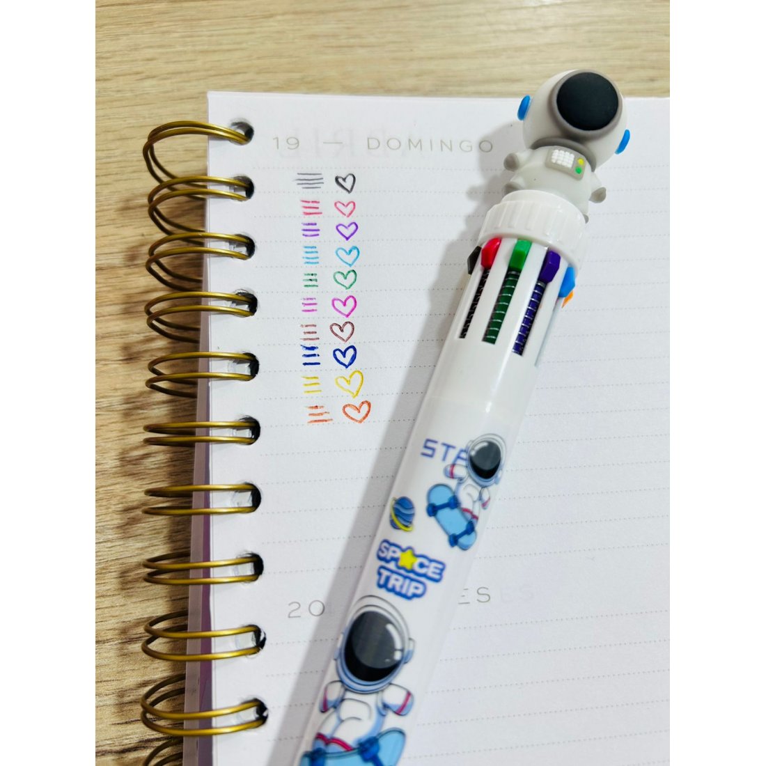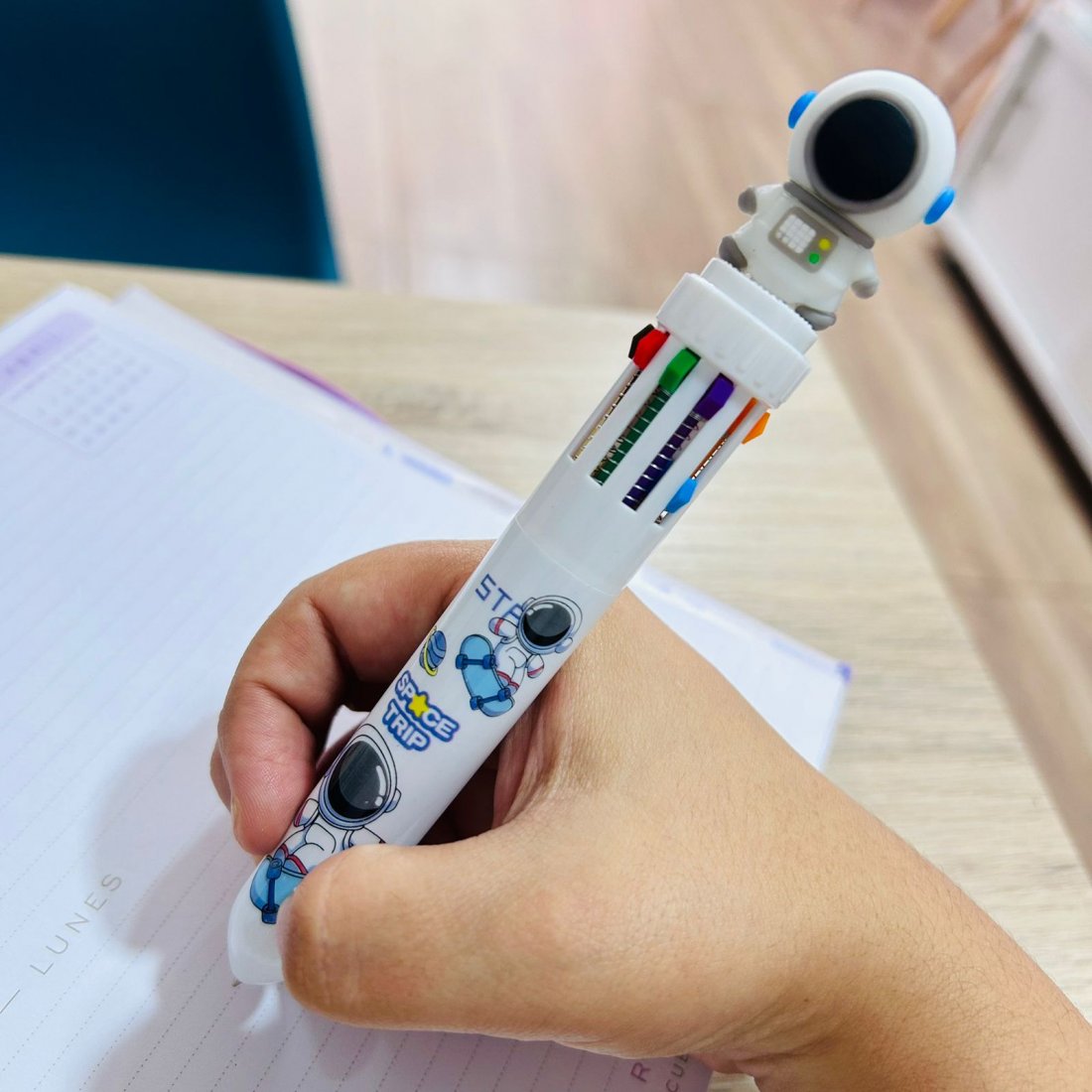 Dale color a tus ideas con este esfero multicolor de diseño espacial. Con un divertido estilo de astronautas, disponible en tres colores (rosado, blanco y negro), incluye 10 colores en un solo esfero, ideales para tomar apuntes, subrayar, dibujar o organizar tus notas de forma creativa. Su sistema retráctil con botones de colores permite cambiar fácilmente entre minas, haciendo que escribir sea más practico y divertido.